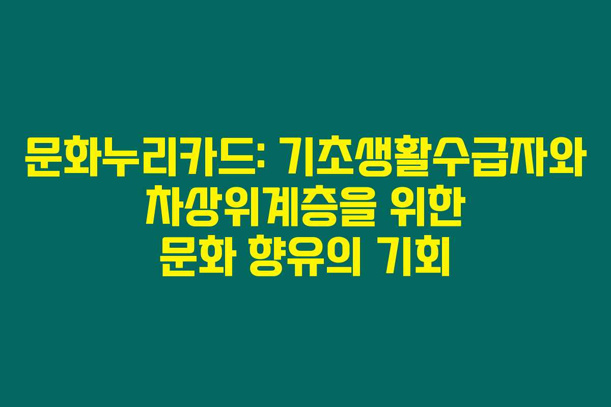문화누리카드는 기초생활수급자와 차상위계층 누구나 쉽게 문화와 여가를 누릴 수 있도록 돕는 중요한 정책입니다. 많은 이들이 이 혜택을 모르고 지나치니, 주변 사람들에게 꼭 공유해 주세요. 문화누리카드로 다양한 문화 경험을 누리길 바랍니다!