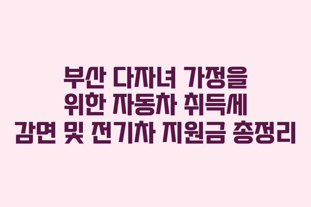 부산시는 다자녀 가정을 위한 다양한 혜택을 새롭게 확대하여 경제적 부담을 줄이고 있습니다. 특히 자동차 취득세 감면 및 전기차 구매 지원금의 확대는 많은 가정에 실질적인 도움이 될 것으로 기대됩니다. 여기서는 이와 관련된 내용을 자세히 살펴보겠습니다.