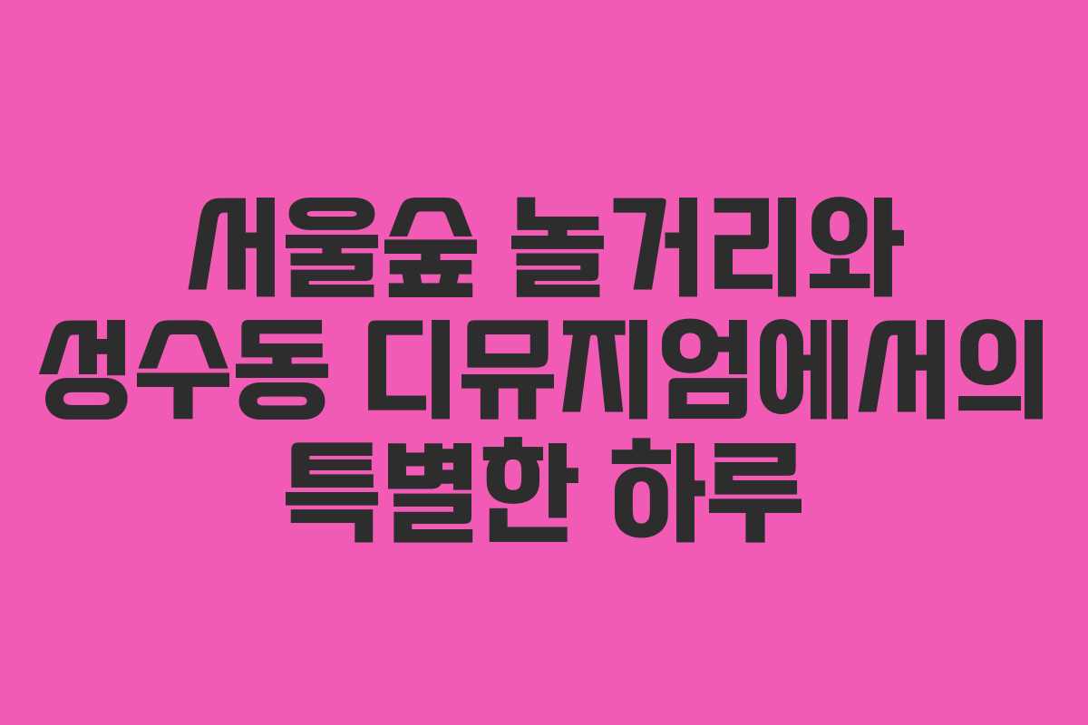 서울숲은 도심 속 작은 자연의 쉼터로, 다양한 즐길 거리가 가득한 곳이다. 이곳에서 성수동의 디뮤지엄과 아르브 향수 클래스를 경험하며 잊지 못할 하루를 보낼 수 있다. 서울숲은 가족, 친구, 연인 모두와 함께 다양한 활동을 즐길 수 있는 공간으로, 특히 최근의 변화와 함께 더욱 매력적인 장소로 탈바꿈하고 있다.
