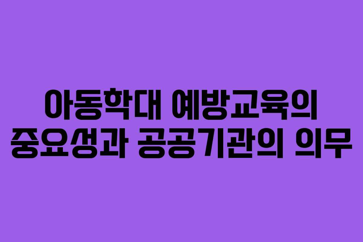 아동학대 예방교육은 모든 공공기관에서 필수적으로 이수해야 하는 법정의무교육 중 하나로, 아동의 안전과 복지를 보장하기 위해 매우 중요하다. 아동에 대한 이해와 학대 예방을 위한 교육은 직원들이 아동을 보호하는 데 필요한 지식과 기술을 갖추도록 도와준다. 본 글에서는 아동학대 예방교육의 개념, 교육의 의무, 그리고 교육 이수 방법에 대해 자세히 살펴보겠다.