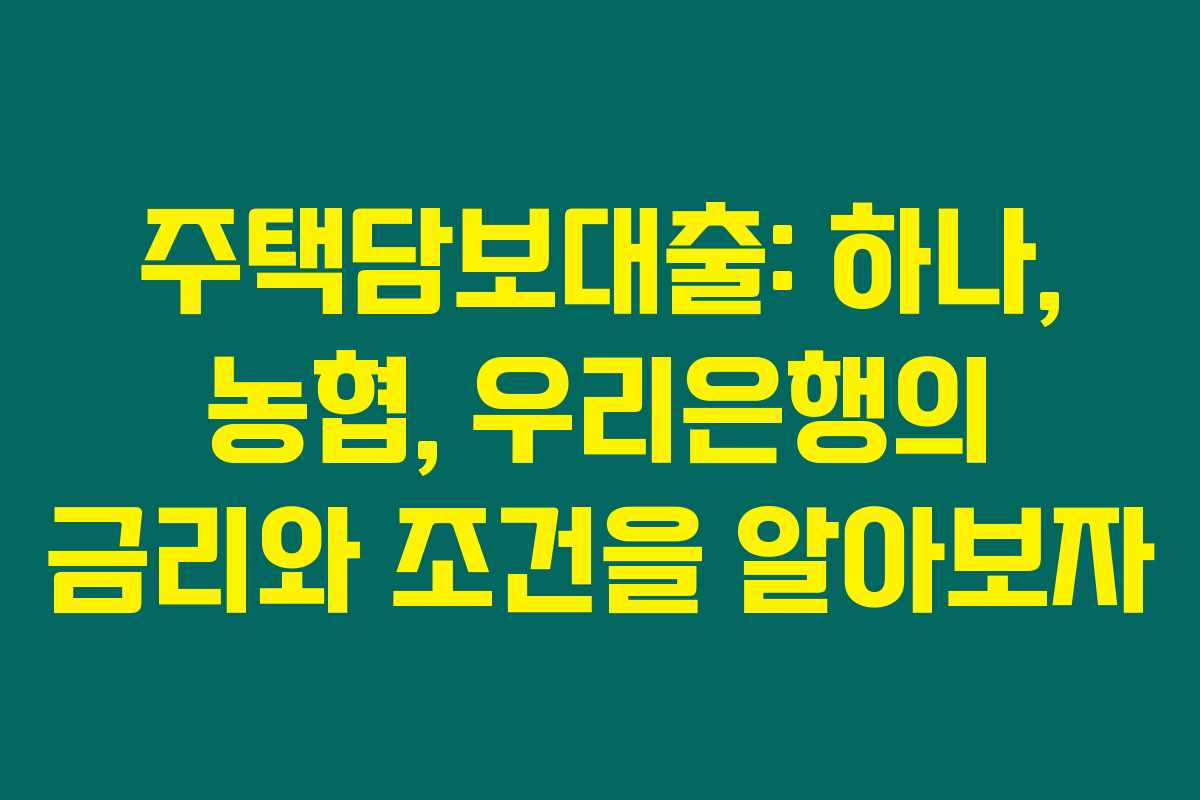 주택담보대출은 많은 사람들이 집을 구매하기 위해 필수적으로 알아야 할 금융 상품입니다. 제가 직접 경험해본 결과로는, 대출을 받을 때는 각 은행의 주택담보대출 금리, 대출 기간, 자격 조건, 한도를 잘 비교하고 이해하는 것이 중요하답니다. 아래를 읽어보시면 하나은행, 농협은행, 우리은행을 비교하며 최적의 대출 상품을 선택하는 데 도움이 될 것입니다.