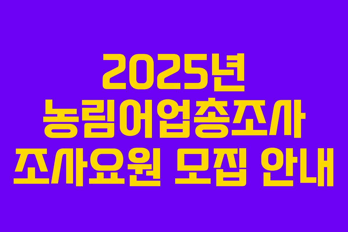 2025년 농림어업총조사의 조사요원 모집이 2025년 10월 27일부터 11월 12일까지 진행됩니다. 이 기회를 통해 많은 지원 바랍니다.