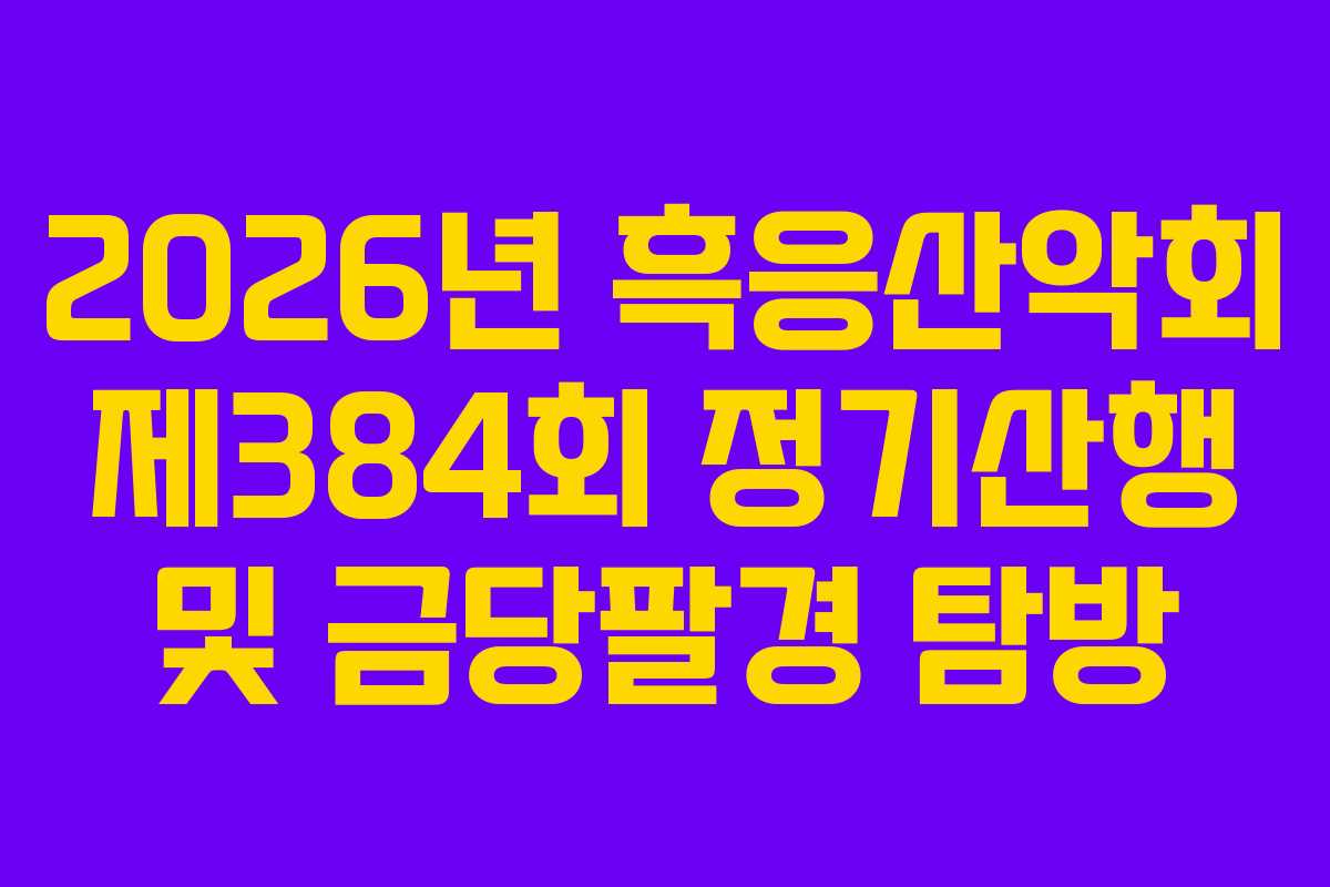 2026년 6월 9일에는 경남 산청군의 황매산에서 제385회 정기산행이 예정되어 있다. 이번 산행은 더욱 많은 회원들이 참여하여 자연을 즐기고 서로의 우정을 확인하는 기회가 될 것이다. 계획된 일정에 맞춰 회원들은 사전 준비를 통해 더 많은 이들이 함께할 수 있도록 노력할 예정이다.